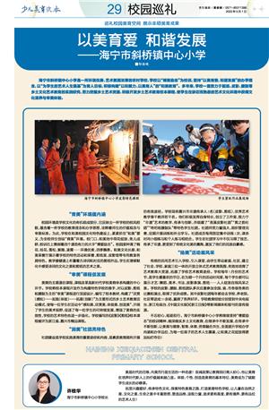 海宁市斜桥镇中心小学是一所环境优美、艺术氛围浓厚的农村学校,学校以“博爱励志”为校训,坚持“以美育爱,和谐发展”的办学理念,以“为学生的艺术人生奠基”为育人目标,积极构建“以和聚力、以美育人”的“和美教育”。多年来,学校一直致力于剪纸、皮影、腰鼓等乡土文化艺术教育的实践研究,努力挖掘乡土艺术资源,积极开发乡土艺术教育校本课程,使学生在亲切而熟悉的艺术文化环境中获得文化滋养与审美体验。