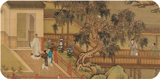 | 萱草、石榴花与蜀葵 让我们由下至上慢慢欣赏这幅画。画面的最下端,一位老者拄杖前行,身后跟着两个童子,一人手捧“角黍”,一人怀抱瓶花,他们主仆三人像去赴宴。一旁的回廊中,还有两个仆人,他们一人拎着酒,一人捧着盘,也像是为宴会所预备的。 角黍【shǔ】也叫粽子,是端午节的节庆食物。相传,战国时楚国大夫屈原,在楚国的郢都被秦军攻破后,自沉于汨【mì】罗江,以身殉国。屈原死后,楚国百姓哀痛异常,纷纷涌到汨罗江边去凭吊他。百姓们将角黍投入江中喂饱鱼虾,为的是不让鱼虾去咬屈大夫的身体。于是,角黍就这样流传了下来,还成为了端午宴会上不可缺少的美食。 根据以往对于这组系列绘画的解读,我们发现画中的植物往往暗示了时间,这幅五月也不例外。小童手捧的瓶花中有萱草花,再加上院中栽种的石榴与蜀葵,这些植物的花期都在端午前后,它们都被称为“端午之花”。 萱草花,是百合科萱草属多年生草本宿根花卉。它的外形很像百合,常常被误以为是百合花。萱草花除了可观赏之外,还是一味草药,能辟邪去病。 蜀葵,是锦葵科、蜀葵属多年生草本花卉。它跟向日葵一样,也有“向阳”的特性。蜀葵的花和叶具有解毒散结的功效。跟萱草花一样,蜀葵也是一种能够辟邪去病的花。蜀葵的花色艳丽,是古人庭院中常见的观赏植物。 石榴,原产于中亚,相传是由张骞出使西域时带回的。五月,是石榴花花开最艳的季节,因此五月也被称为“榴月”。清代著名宫廷画家郎世宁,专为端午所创作的《午瑞图轴》中,描绘的就有石榴花。 |