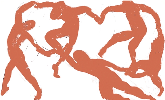 ❶在临摹绘制这幅《舞蹈》时,因为马蒂斯的《舞蹈》画面主体由5位舞动着的人物构成,因此在过程1中,我首先确定了5个人物的大致位置,起初对于人物位置的确定,我选择了先定位,再用颜色直接勾勒的概括形式。