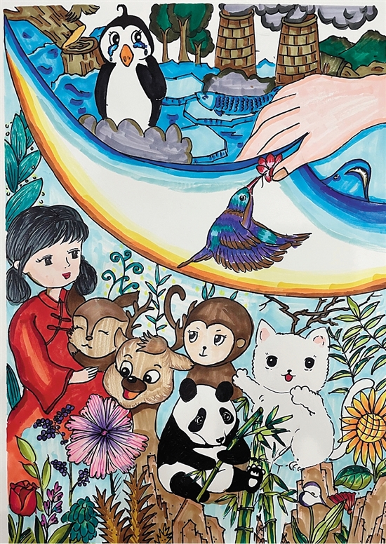 这是一幅环保主题的画。画者用了极富浪漫的绘画手法,想要把一切污染、破坏、伤害像翻书一样翻过去,剩下的就是人与动物的和谐相处。这是一个非常美好的愿望,看画的我们也能感受到画者的真善美。