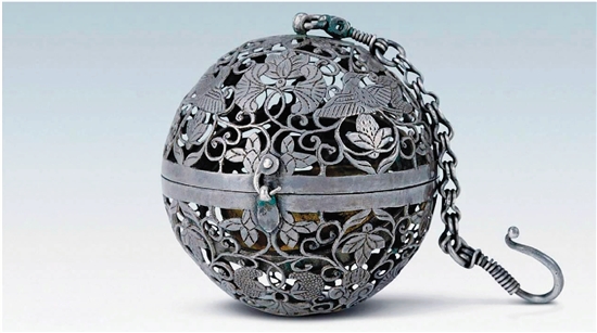 唐葡萄花鸟纹银香囊以球体形状为主,圆形线条给人以舒适、圆满的感觉,展现了柔软、温和的个性。唐葡萄花鸟纹银香囊表面满饰葡萄花鸟纹饰,纹饰自然婉转,疏密考究,线面得体;花纹以顶点和底点中心均匀对称分布,体现了对称的形式美,平衡构造原理与现代陀螺仪相同,显示了极高的设计水平。通体镂刻葡萄花鸟纹,香囊外层镂刻的花纹,不仅具有极佳的装饰性,而且便于香烟飘散。