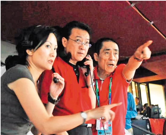 崔巍(图左一)与张艺谋在2008年奥运会开幕式现场