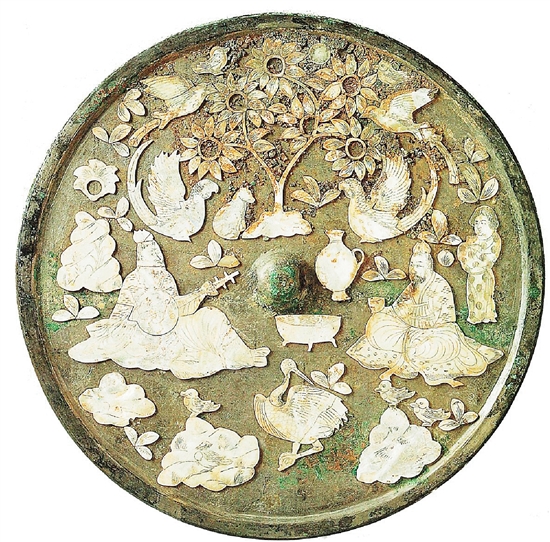 唐代 嵌螺钿人物花鸟纹漆背镜
