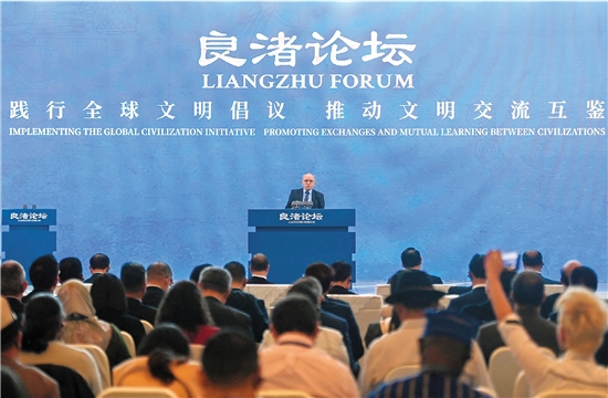 12月3日,阿尔巴尼亚爵士音乐节国际关系总监易杰·阿里卡在“良渚论坛”上发言。 新华社记者 黄宗治/摄