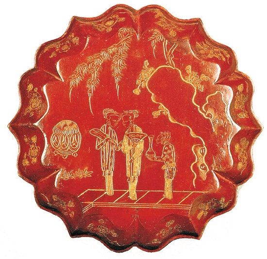 南宋 朱漆戗金莲瓣式人物花卉纹奁(盖面) 通高21.3cm