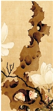 | ▲太湖石(局部) 太湖石也叫“窟窿石”或者“假山石”,它实际上是一种“石灰岩”。因为它出自太湖地区而被人们称作“太湖石”。中国古代的园林中很少像西方那样竖立一座座雕塑,却少不了各种姿态的石头。古人喜爱石头,常常将它们放置在园林中,营造出“山水的意境”。古人认为太湖石的美,有四个标准:“瘦、皱、漏、透”,又瘦又多孔的太湖石更受欢迎。画中的太湖石就有意夸张了这四个特点:这块太湖石特别的瘦,顶部甚至有尖锐的感觉;造型很挺拔,还有很多圆孔;从石头底部的石孔中,可以看到背后的海棠花,这体现了石头的“漏与透”。画家绘制的太湖石刚硬、厚重,层次丰富。 |