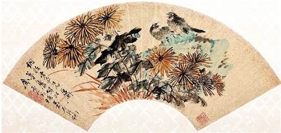 虚谷 朱偁 菊石双禽图扇页 纵18.9cm、横53.9cm