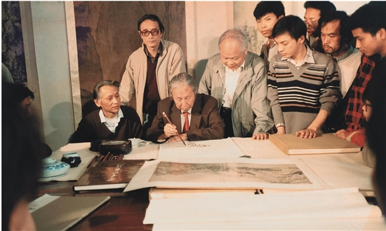 1989年,陆俨少先生进行教学示范,左起童中焘、卓鹤君、陆俨少、孔仲起