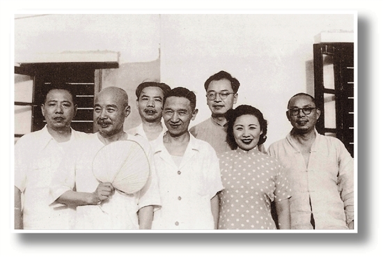 香港合影(左起:顾坤伯、陶心如、钱瘦铁、胡品生、唐云、蒋佩瑶、若瓢和尚) 1950年摄