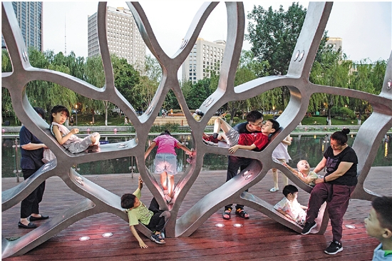 2023年,城市夏日“会客厅”——当塞纳河遇见亮马河举行,这是人们在北京亮马河畔的城市雕塑设施休闲纳凉。 新华社记者 孙瑞博 摄