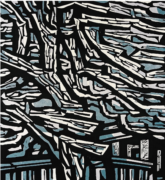 车进 蓝天下的葛岭 65×60cm 套色木刻