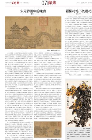 宋代界画中最典型的一件龙舟竞渡题材作品,当数天津博物馆藏的《金明池争标图》。此画有款“张择端呈进”,但从其本身的时代风貌和风格特征来看,实际作者应另有其人,有学者认为此画或为南宋刘松年的早期作品。《金明池争标图》为绢本册页,尺寸约28厘米见方,描绘了北宋时期金明池龙舟竞渡的盛景。画中苑墙合围,环栽桃柳,岸边列置有宫殿、楼阁、水亭、船坞、矮棚。池中央筑有十字平台,其上筑有一座殿宇,殿墙呈圆形环绕。朱红色的拱桥连通十字平台和左岸,桥下有小舟穿行,左岸上建有高台和宫阙。水上有一艘巨大的龙舟,其上宫阁层叠,旁有十艘小龙舟分列两侧,每艘约有十人划桨,船头有一人站立持旗。靠近岸边的水面上还有十余人正作水上杂技,另有许多大小不一的小艇。画面左下角有一牌楼,隐约有“琼林苑”字样。苑墙内外皆是熙熙攘攘的人群,数量成百上千。画家笔力精微,尽管人物小巧如蚁,还是识出军卒、官宦、乐舞、仕女、商贩、幼童等不同的身份,各尽其态,比例得宜。画中的宫室、台阁、龙舟等均以界笔绘制,工整细腻。