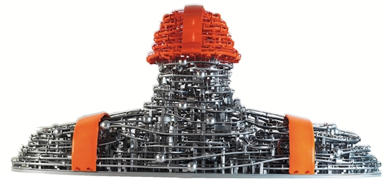 谷德昊:远看像一个工人,一个大国工匠的造型,其实近看有很多复杂、交错的轨道,有点像我们现在的地铁、高架桥的路网。这是用磁力、电磁来进行推动的,在主题性的创作基础上加入了一些技术、科技的元素在里面,形成了动态、比较新奇的效果,比较符合我们大国工匠的智慧、科研凝结出的成果,把它和雕塑本体的形象进行结合,形成这样一件作品。