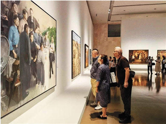 十四届全国美展油画作品展现场,观众正在仔细观赏作品