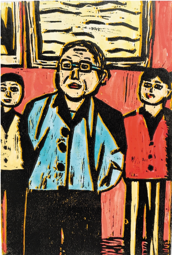 这幅版画作品色彩丰富且对比强烈,运用了鲜明的红、黄、蓝三原色,给人留下深刻的印象。作品刻画的人物表情生动,尤其是钱绍钧爷爷的形象栩栩如生,充满了生活气息,整体风格简约而传神。