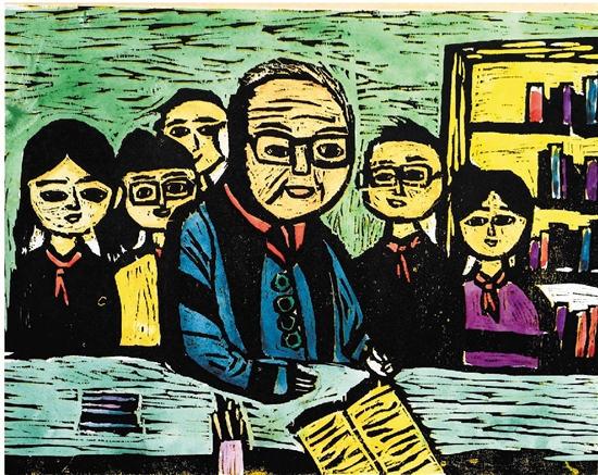 这幅版画作品采用了鲜明的色彩和简洁的线条,画面充满活力与亲和力,构图紧凑,主题突出。作品中的木刻痕迹富有表现力,增强了画面的质感和视觉冲击力。