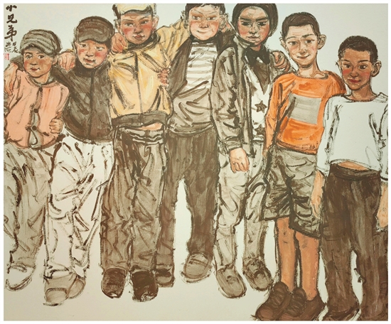 这是以写意的手法完成的一组男孩子们的中国画。作品构图简练,设色朴实,毫不夺人耳目。用笔流畅有力,绝不拖泥带水。画面中的小朋友们很随意地站立,各具情态,有的一看就有不可侵犯的威严,有的一看就聪明伶俐,有的把朋友紧紧地搂在一起。看得出来,画家有一双敏锐的眼睛,他一下子就能抓住孩子们的性格特点,再加上他有过人的表现技能,才能生动表现出孩子们的性格和特征。