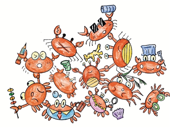 下面的图中有着许多憨态可掬的小螃蟹,有的手拿铅笔,有的眼戴墨镜,那大家能不能找到哪只小螃蟹手中拿着芦苇呢?请各位小侦探来找一找并把它圈出来!