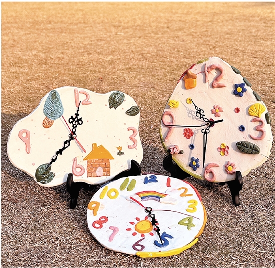这组陶艺作品通过三个不同形状的钟面展示了时间的流逝与永恒。每个钟面都装饰有花朵、树叶和其他自然元素,象征着生命的循环和时间的连续性。作品运用了丰富的颜色和纹理,增强了视觉吸引力,并传达了一种宁静和谐的感觉。