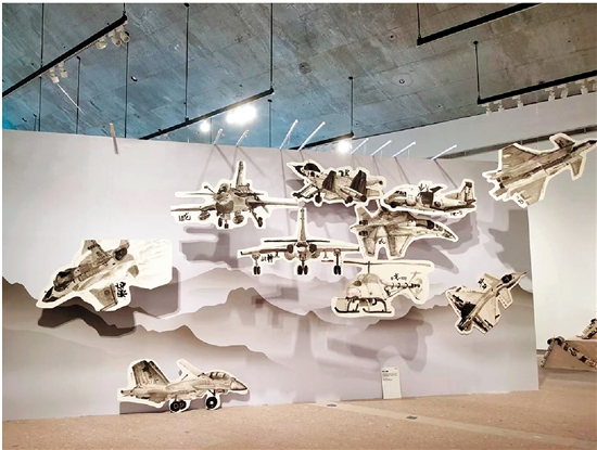 此幅作品是一件展示中国军事力量的艺术装置,呈现了多种现代化武器装备,包括战斗机、直升机等。这些模型被精心绘制并悬挂在墙上,形成一个动态的视觉效果。整体色调为黑白灰三色,简约而有力地传达出国家的强大实力和科技进步的信息。