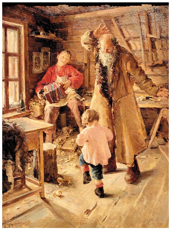 一间破旧的木匠房内,怎么传来了欢乐的手风琴声?原来木匠老爷爷和孙子跳起舞来了!老爷爷虽然动作不像年轻时那么奔放了,但是小孙子跳得有模有样,实在招人喜欢。不过,画家只画了小孙子的背影,还能让他成为画面的中心人物,这实在是一个巧妙的处理。你知道为什么吗?