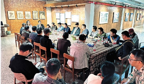 ◀教师创作专题研讨会。研讨会学术主持:中国人民大学美学博士、宁波大学潘天寿建筑与艺术设计学院美术系主任、综合材料绘画研究中心主任陈晟。