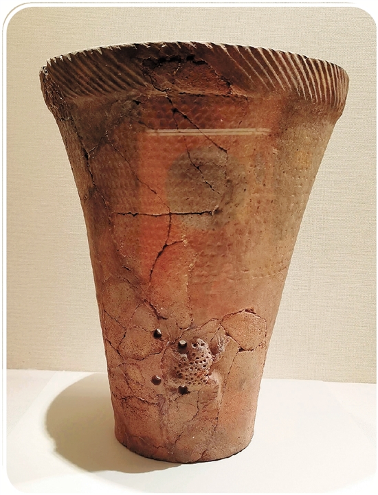 阜新查海遗址出土的新石器时代陶罐上的蛇衔蟾蜍雕塑