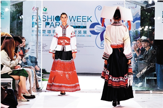 由非遗传承人、艺术院校服装设计师等共同设计制作的中国楚雄非遗服饰时装展亮相2024巴黎时装周 新华社记者 高静/摄
