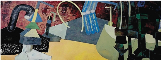王绪斌 曲线与直线的木偶剧 220×600cm 油画 2022年