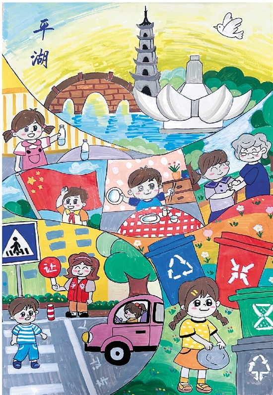 作品色彩鲜艳丰富。画面展现多样文明场景,有礼让行人、垃圾分类等,人物形象可爱,构图饱满。背景的平湖地标增添地域特色,整体传达出文明新风尚,充满童真与正能量。