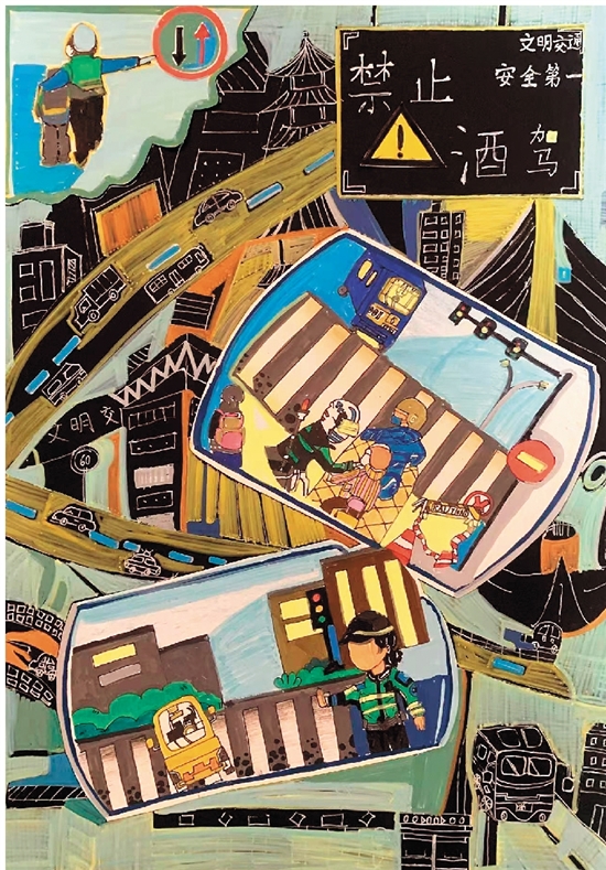 作品主题鲜明,聚焦交通安全。画面中交警、行人、车辆等元素丰富,色彩搭配和谐,既有警示标志又有温馨场景。构图新颖,通过不同画面组合,展现孩子对文明交通的理解与期盼。