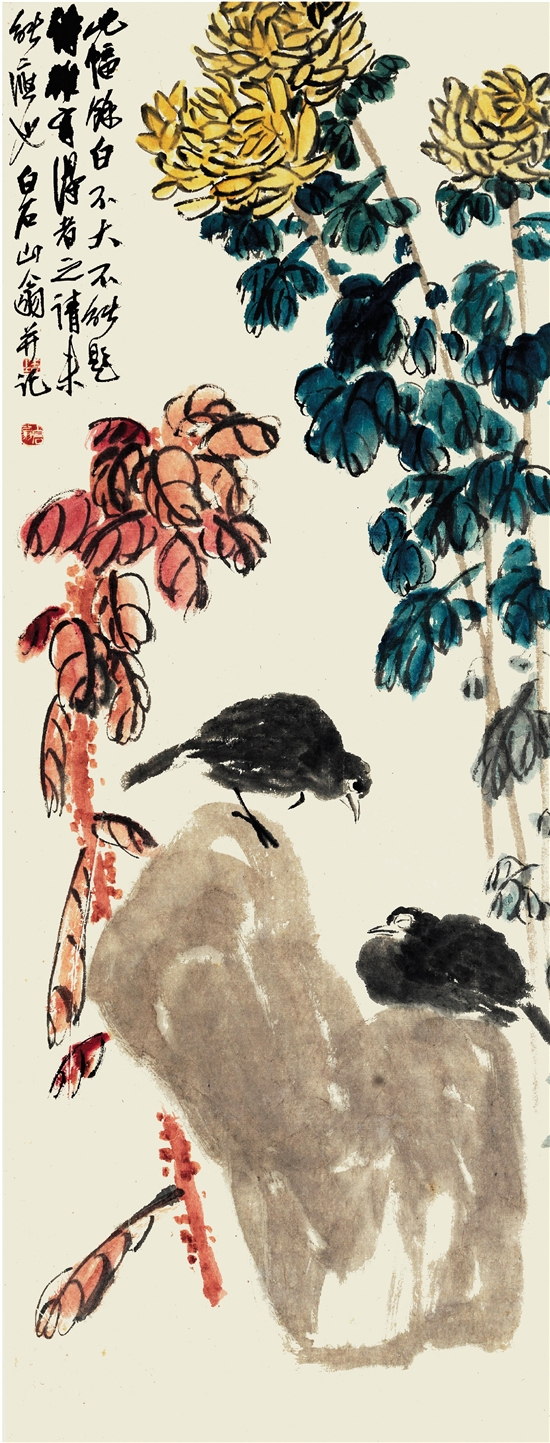 齐白石 菊石双乌图 119×45.5cm 无年款