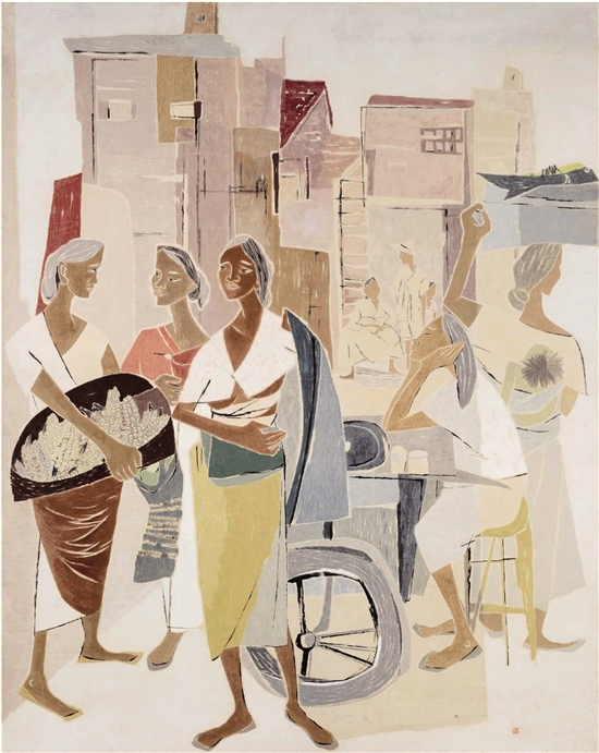 ◀朴崃贤(韩国) 地摊儿 267×210cm 纸本水墨设色 1956年 韩国国立现代美术馆藏(选自“艺韵华章——中韩水墨作品展”)