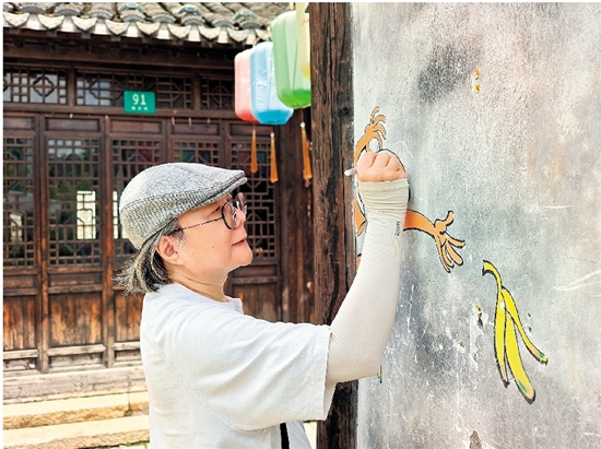 ▲孙绍波在枫泾古镇创作创意涂鸦