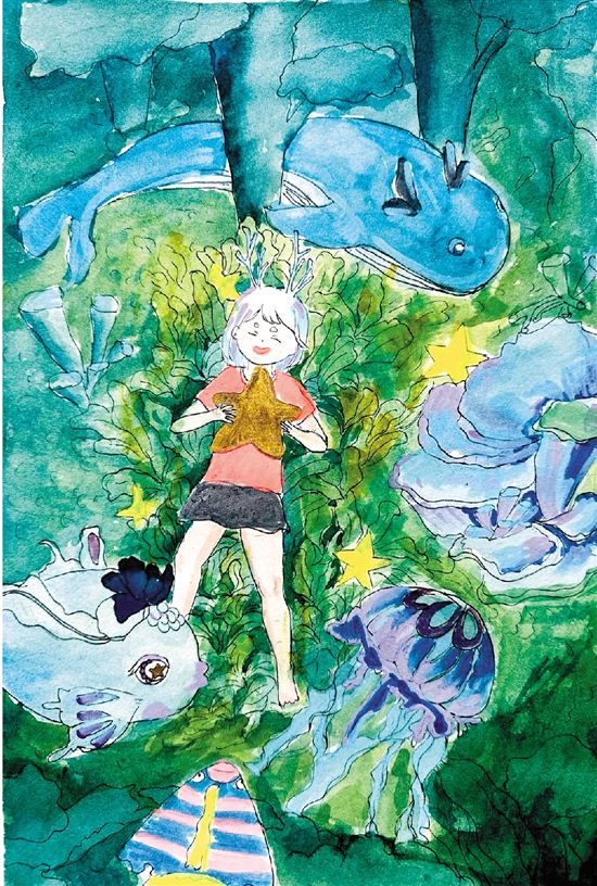作品构图巧妙,充满童话色彩。小女孩头长鹿角,手持星星,周围有各种可爱的海洋生物陪伴,仿佛置身于一个梦幻的海底世界。细节处理细腻,色彩搭配和谐,整体画面充满了想象力。