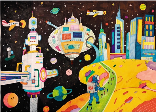 画面中的人物动作生动,表现出探索宇宙的好奇心和勇气。整体构图巧妙,细节处理到位,给人以无限遐想的空间。