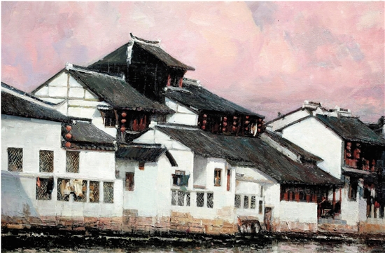 张祖英 红云下的朱家角 120×80cm 布面油画 2025年
