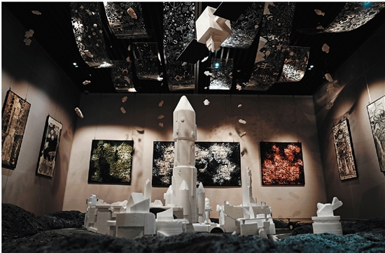 “筑梦航天 艺起星河”平湖市独山港镇航天美育展览现场,平湖市黄姑实验学校少年问天艺术社团开设于2020年9月,目前汇聚了22位热爱航天美术的学生,每周固定开设2课时,以多元创作形式解锁航天艺术表达的无限可能。