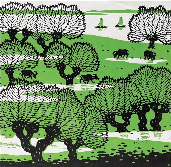 力群 春到洞庭湖 41×41.2cm 1981年 套色木刻(作品选自“碧水东流——中国美术馆藏长江主题艺术精品展”)