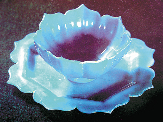 玻璃莲花盏、托:元,盏口径8.6cm,高4.8cm,托口径12.5cm,高1cm,出土于甘肃省漳县元汪世显家族墓,甘肃省博物馆藏。