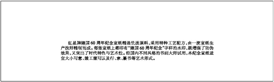 红星牌建国60周年纪念宣纸精选优质原料,采用特种工艺配方,由一流宣纸生产技师精制而成。每张宣纸上都印有“建国60周年纪念”字样的水印,既增强了防伪效果,又突出了时代特色与艺术性。经国内不同风格的书画大师试用,本纪念宣纸适宜大小写意、兼工兼写以及行、隶、篆书等艺术形式。