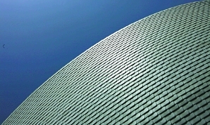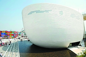 芬兰馆外墙使用鳞状花纹纸塑复合板。主要原料是废纸和塑料,而且全部材料都可以被回收。