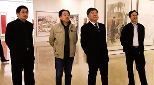 曾先国与韩墨陪同文化部副部长李洪峰、中国美术馆书记殷福在中国美术馆参观青岛画院画展