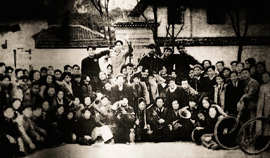 师生们在学校宿舍门口欢迎萧传经等5位进步学生出狱