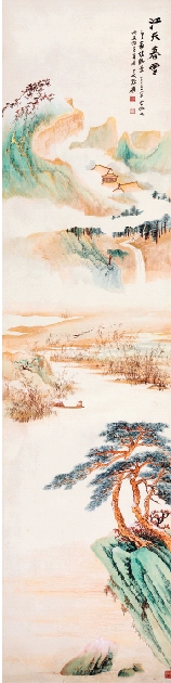 张大千 江天暮雪图 185×47.5cm 金碧山水
