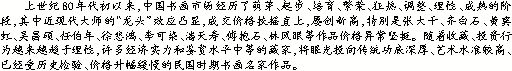上世纪80年代初以来,中国书画市场经历了萌芽、起步、培育、繁荣、狂热、调整、理性、成熟的阶段,其中近现代大师的“龙头”效应凸显,成交价格扶摇直上,屡创新高,特别是张大千、齐白石、黄宾虹、吴昌硕、任伯年、徐悲鸿、李可染、潘天寿、傅抱石、林风眠等作品价格异常坚挺。随着收藏、投资行为越来越趋于理性,许多经济实力和鉴赏水平中等的藏家,将眼光投向传统功底深厚、艺术水准较高、已经受历史检验、价格升幅缓慢的民国时期书画名家作品。