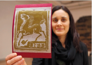 1月25日,在加拿大多伦多的皇家安大略博物馆,一名女士展示“马上功成”木版画。