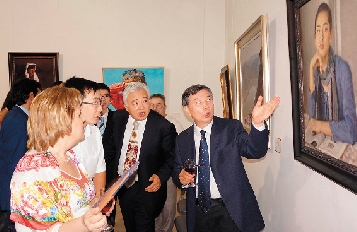 中国美协常务副主席吴长江向中国驻亚使馆田长春大使(中)及亚文化部部长亚瑟·波戈相女士(左)介绍展览作品