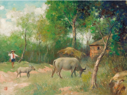 以写实的表现手法描绘乡间的初夏。扎实的写实功底加上深刻的生活体验,对画面层次以及色彩的驾驭轻松、纯熟。笔触细腻,阳光透过密密层层的枝叶透射,天空纯洁蔚蓝,悠闲吃草的水牛与远处举鞭走来的放牛人,让人对美好、淳朴乡村生活产生无限向往。