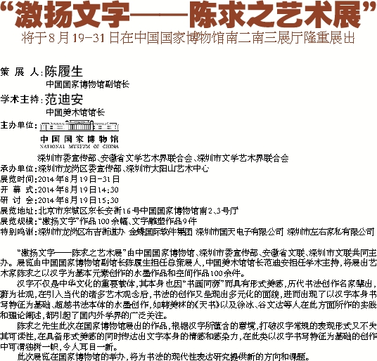 “激扬文字——陈求之艺术展”由中国国家博物馆、深圳市委宣传部、安徽省文联、深圳市文联共同主办。展览由中国国家博物馆副馆长陈履生担任总策展人,中国美术馆馆长范迪安担任学术主持,将展出艺术家陈求之以汉字为基本元素创作的水墨作品和空间作品100余件。